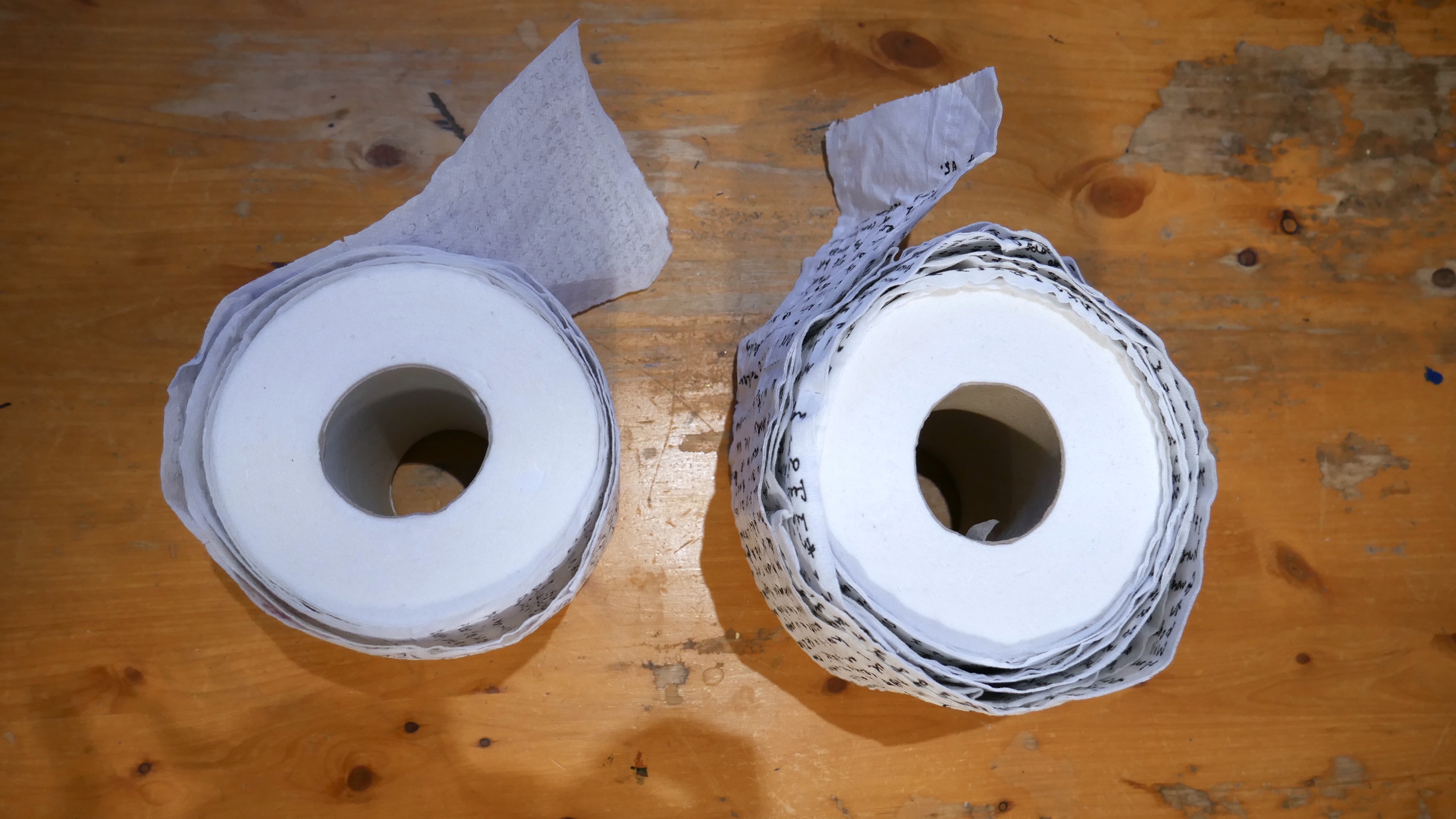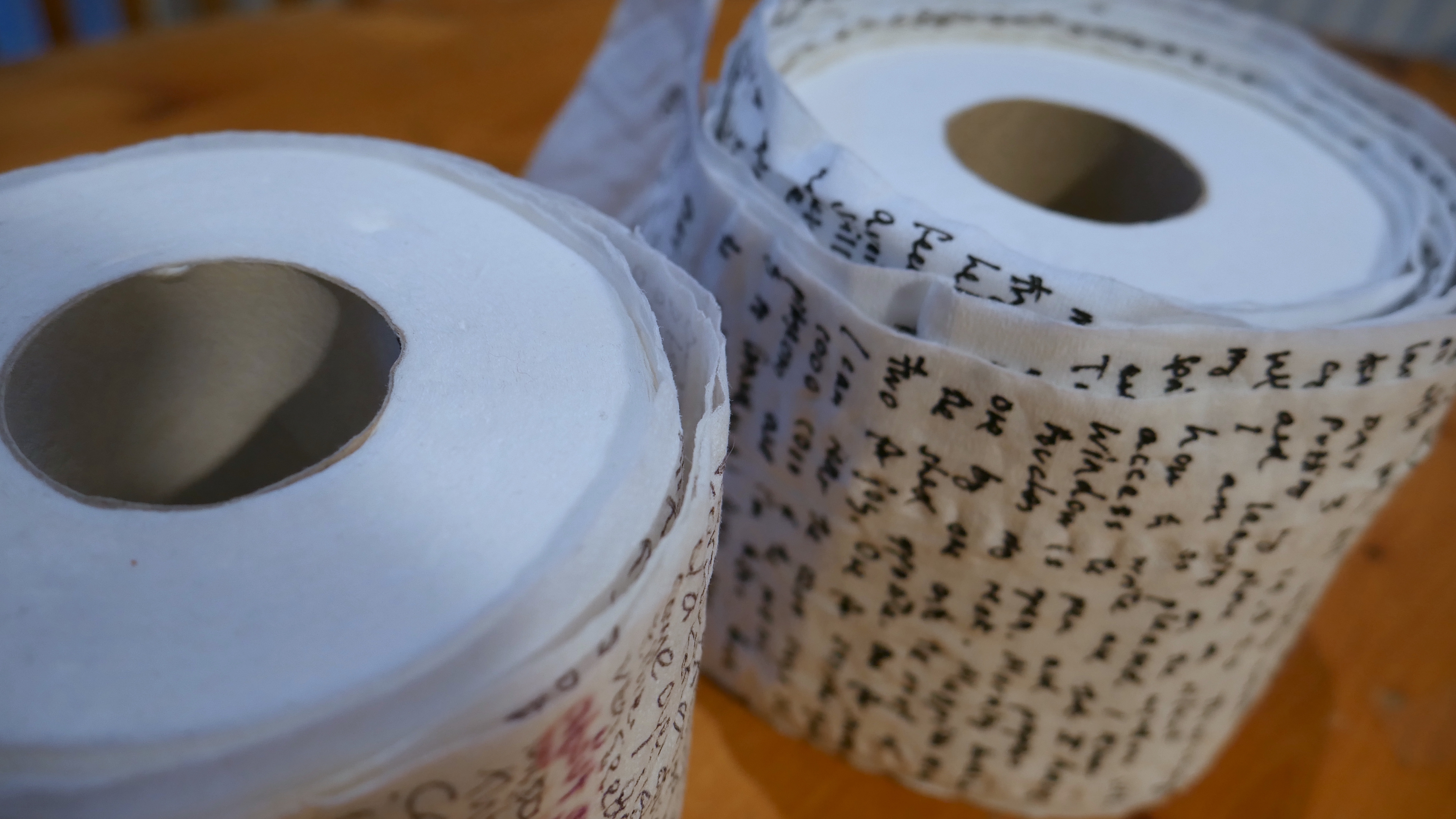 During the COVID lockdown of 2020, I became interested in the surreal symbolism of the toilet roll. It became a coveted item. I began writing on sheets of my toilet roll, intrigued by the idea of treating it as a sacred scroll-like item by inscribing the memories of lockdown on them day by day. I encouraged my mother, also an artist, to do the same. Apart physically - but unified by our need to document and preserve memory. The pieces now exist side by side as connected tangible archive of our experiences during a time of separation, sharing our worries and moments of mindfulness. My mum was teaching in a school with vulnerable children, and dad was working as a care-worker in nursing homes. In 2024, on Covid National Day of Reflection we re-read our diaries for the first time, travelling back as we unravelled the rolls sheet by sheet.
